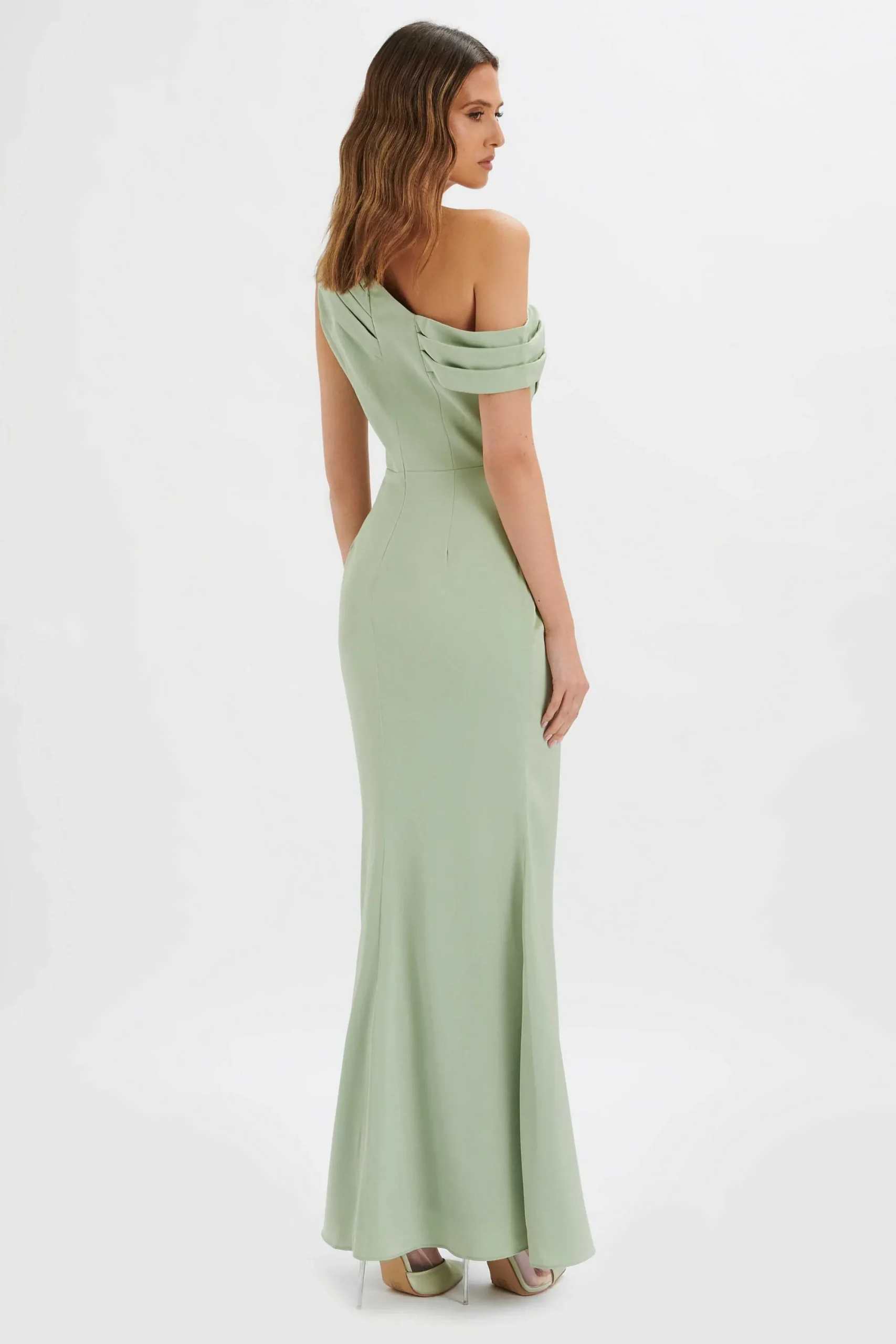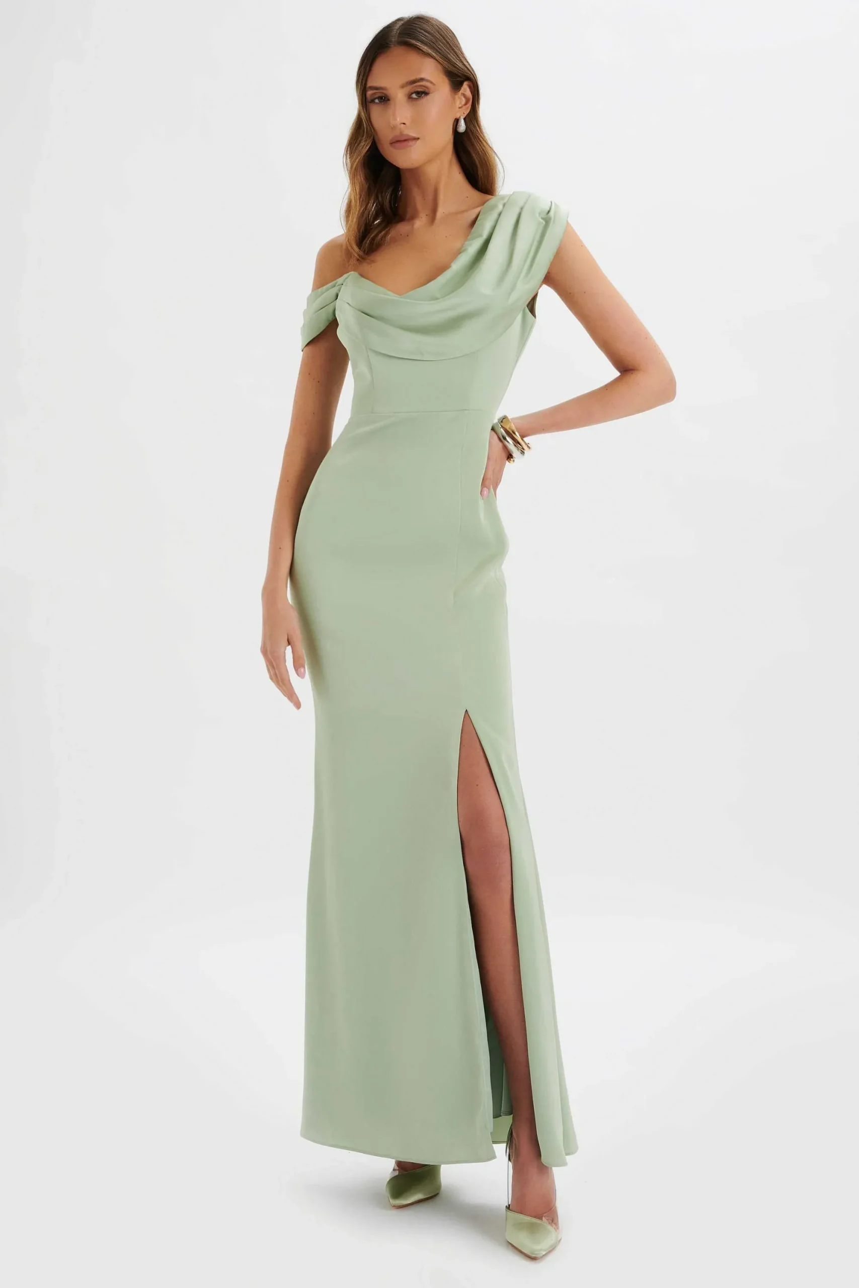Hand Crafted From Our Lustrous Heavyweight Duchesse Satin, Our Annabella Satin Asymmetric Drape Maxi Dress In Sage Green…