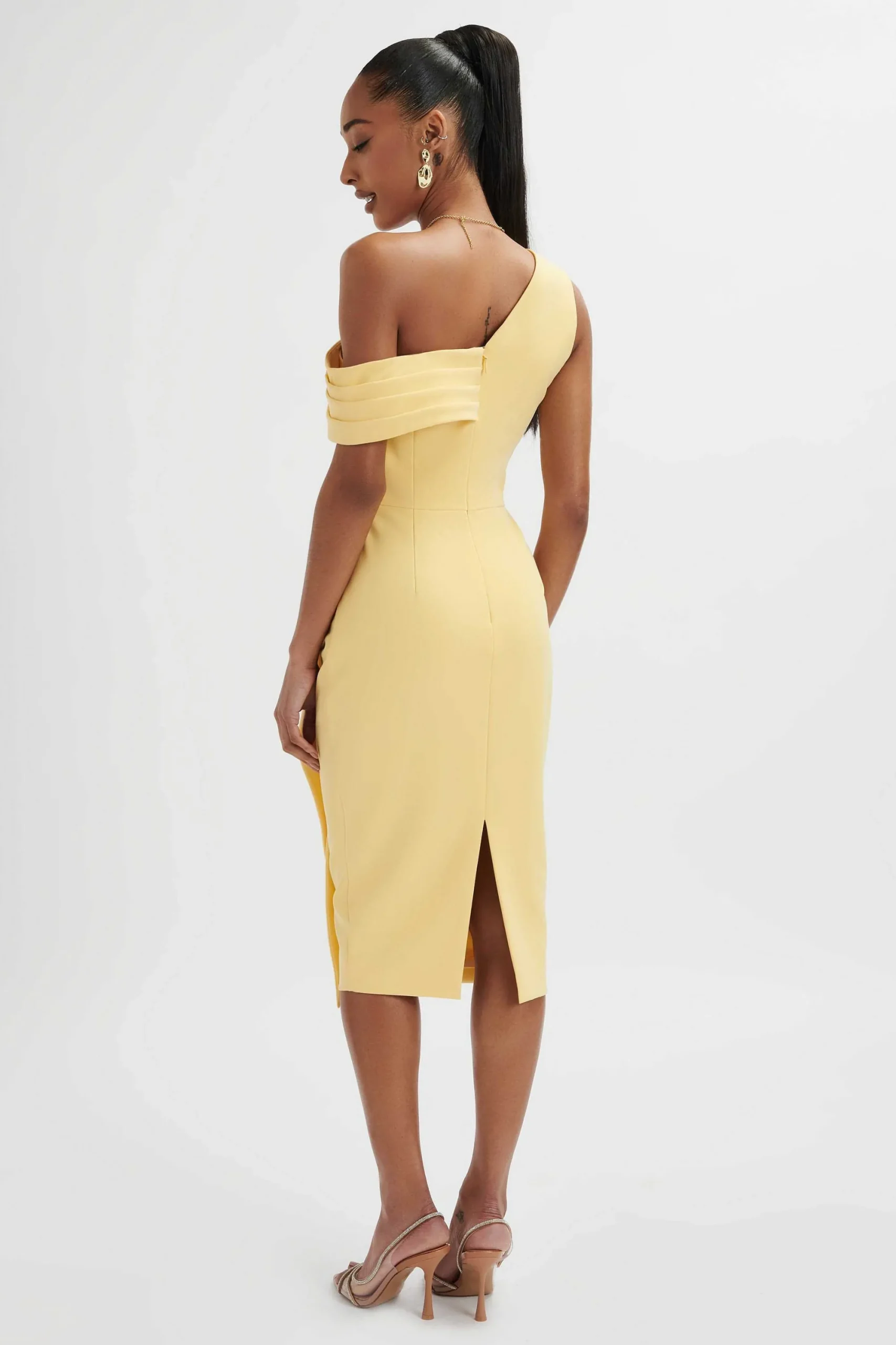 Experience Effortless Elegance In Hannah. Made From Premium Crepe, This Dress Offers A Close Fit That Flatters Your Figure With Bust And Waist Darts. The Elegant Pleated Armband And Self Fabric Drape On The Skirt Add A Feminine Touch To This Pastel Yellow Dress.